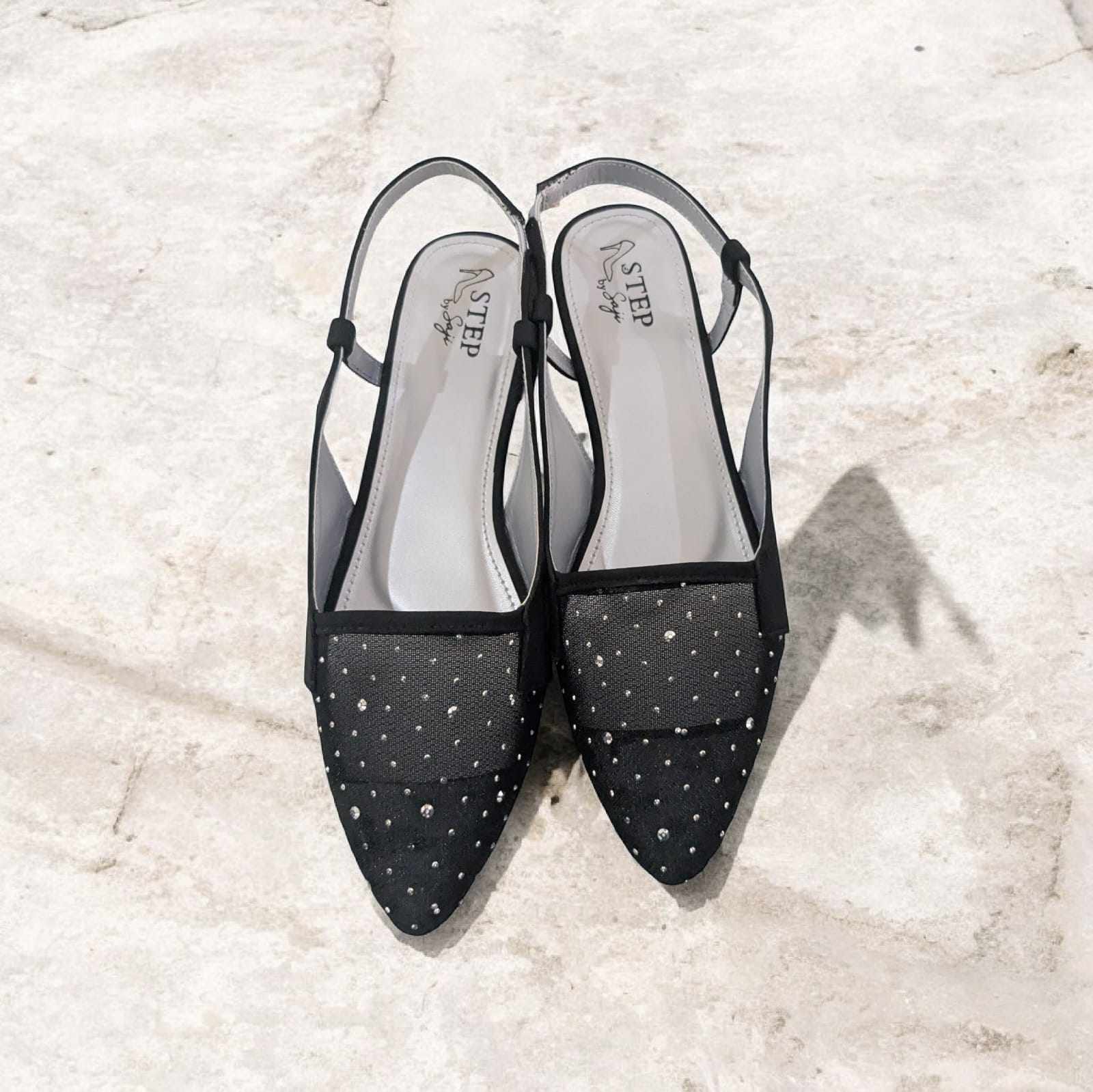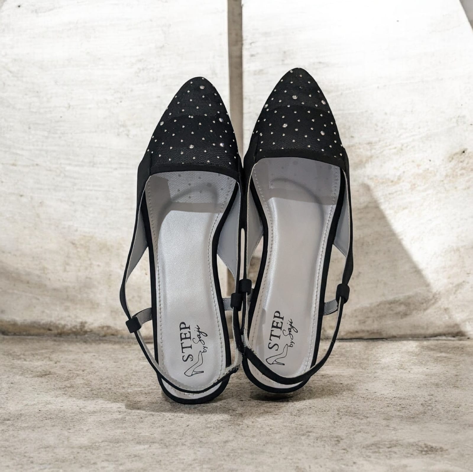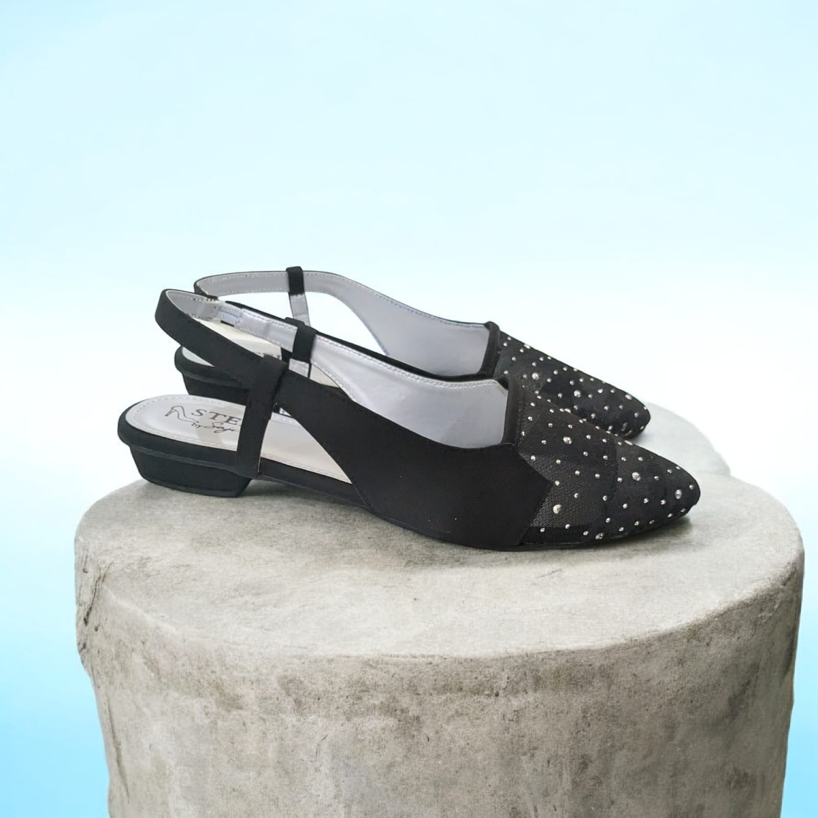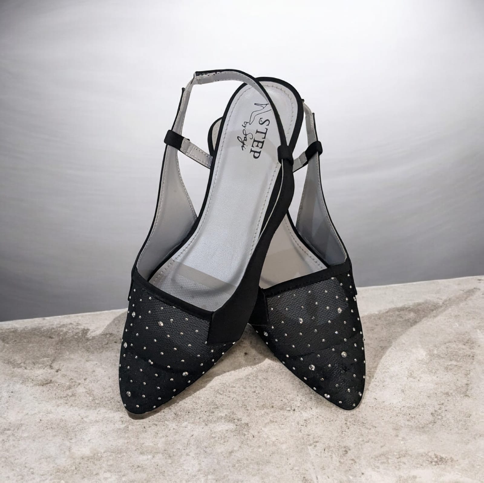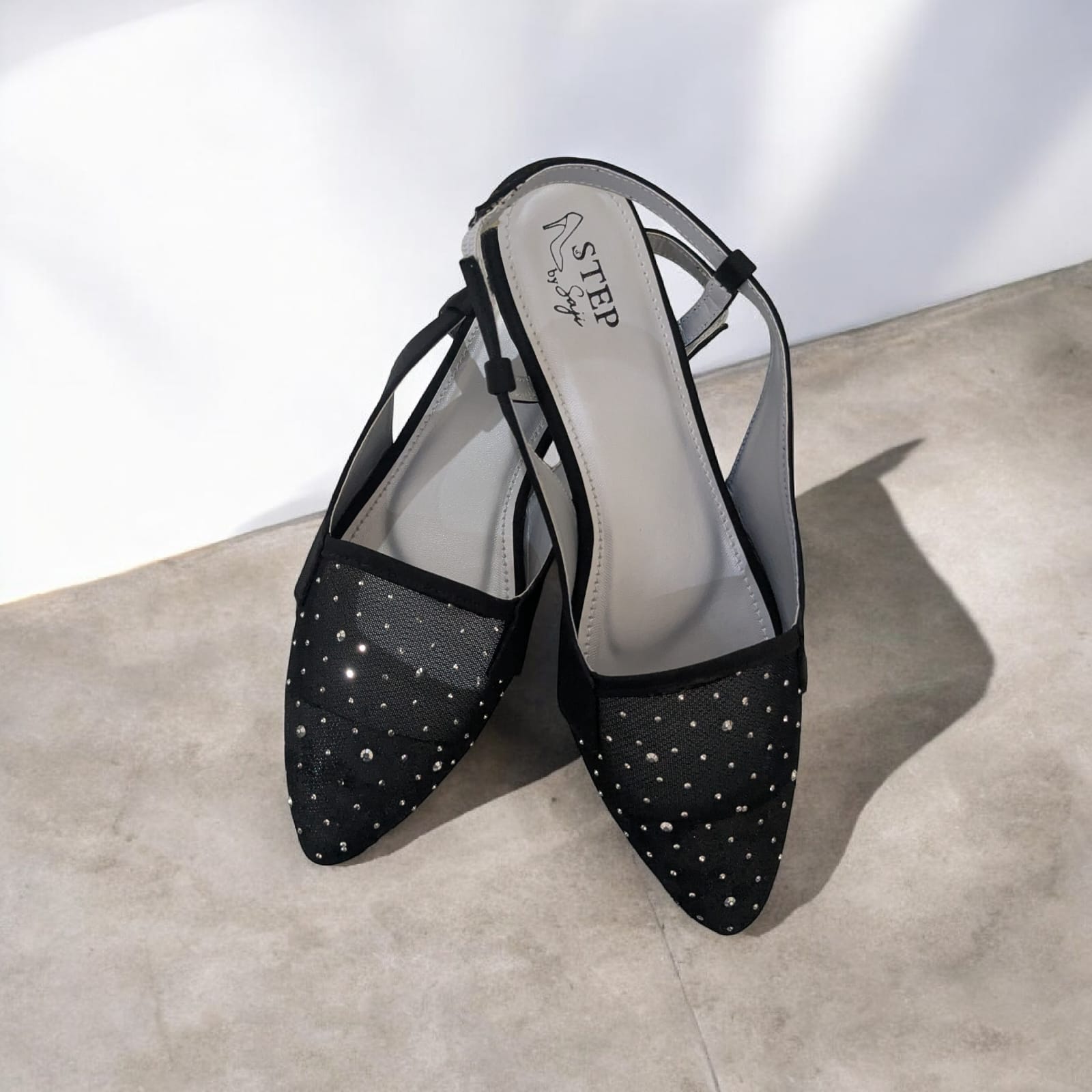 - Chic back-open pumps with a sleek pointed toe and subtle studded detail. The adjustable slingback strap and low block heel deliver confident, all‑day comfort—perfect for office, parties, and evening looks