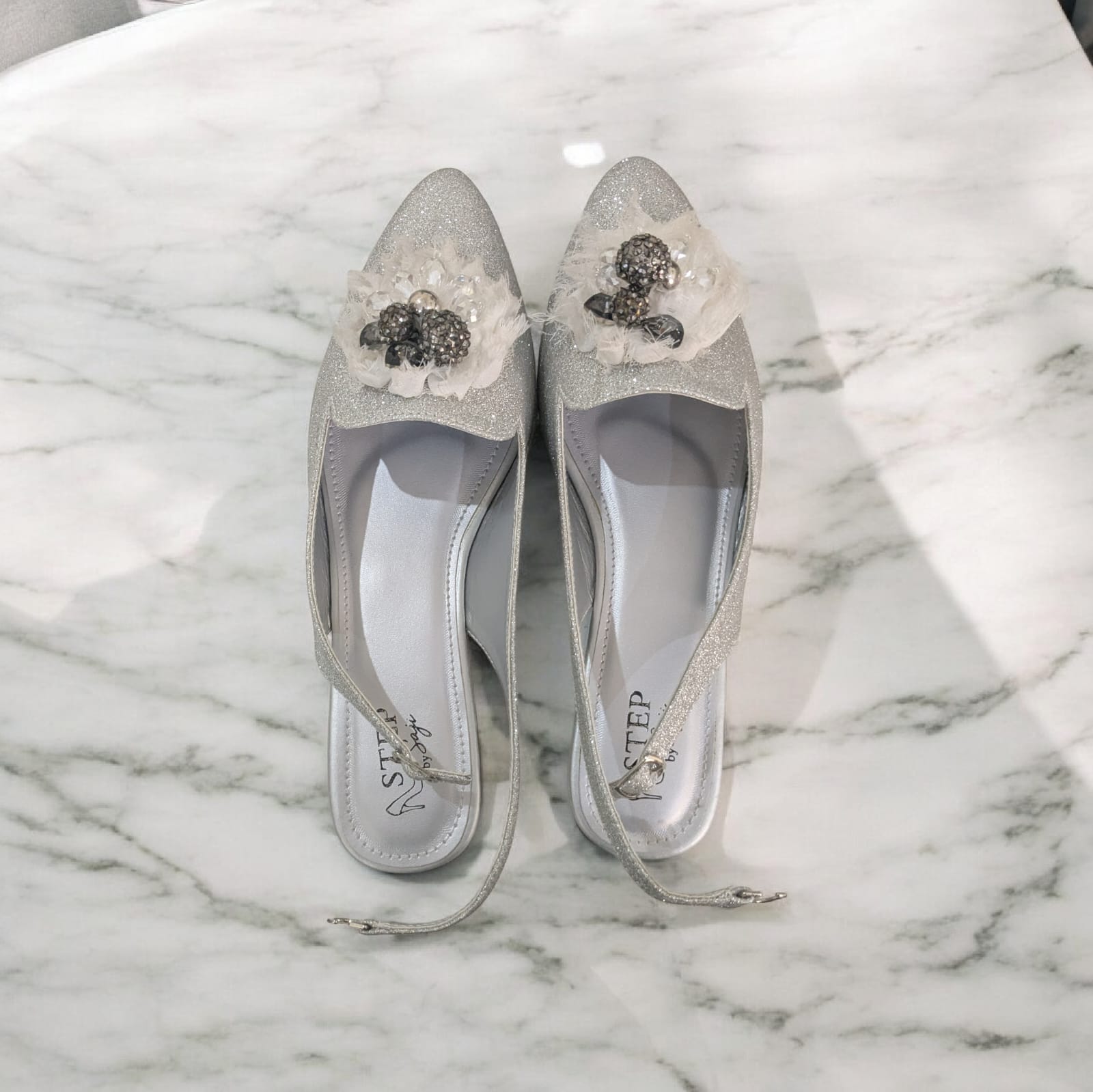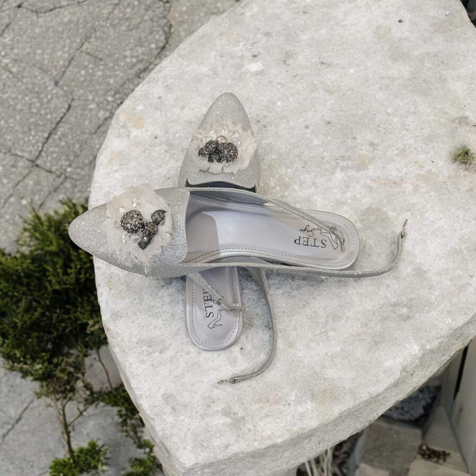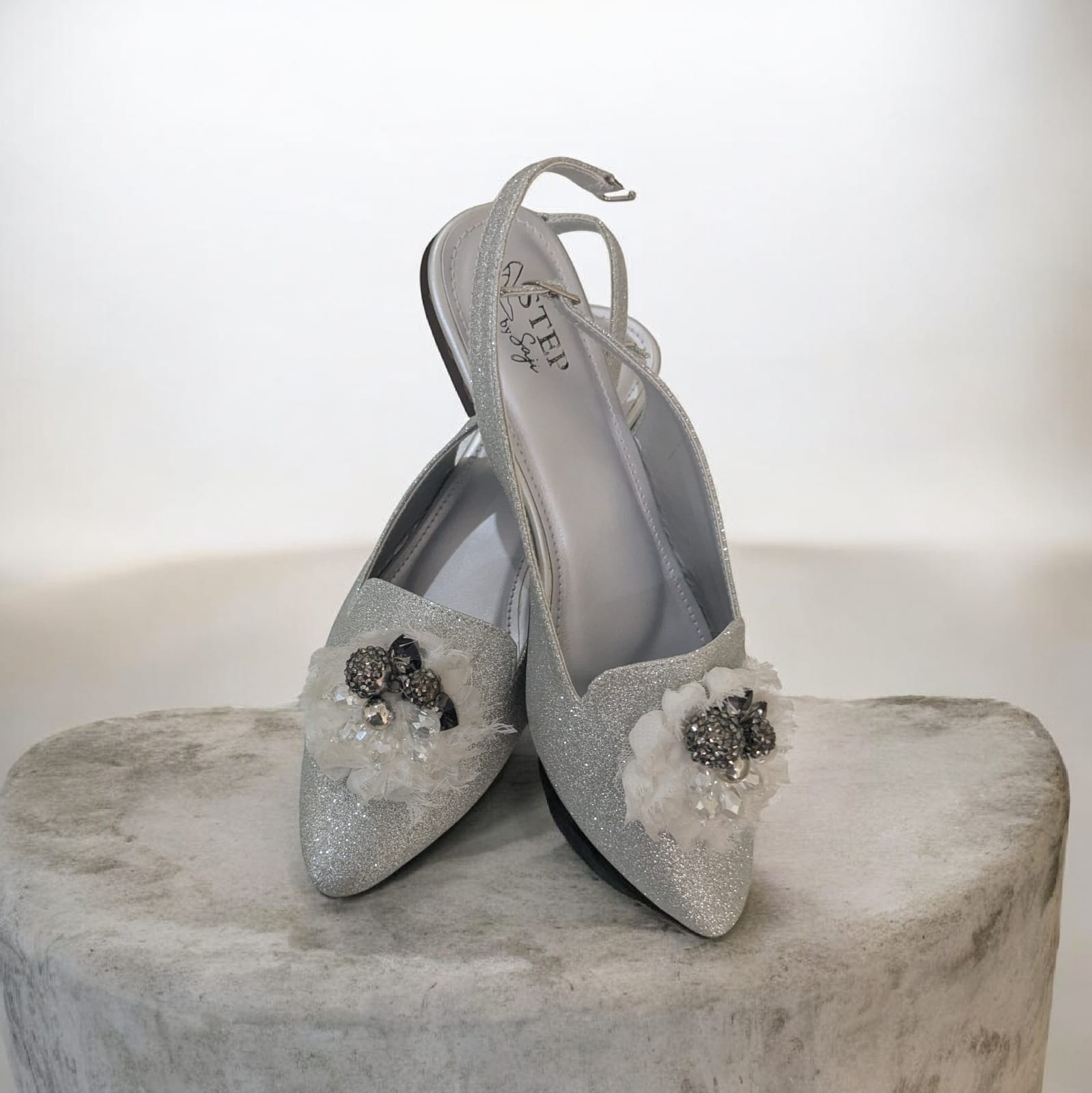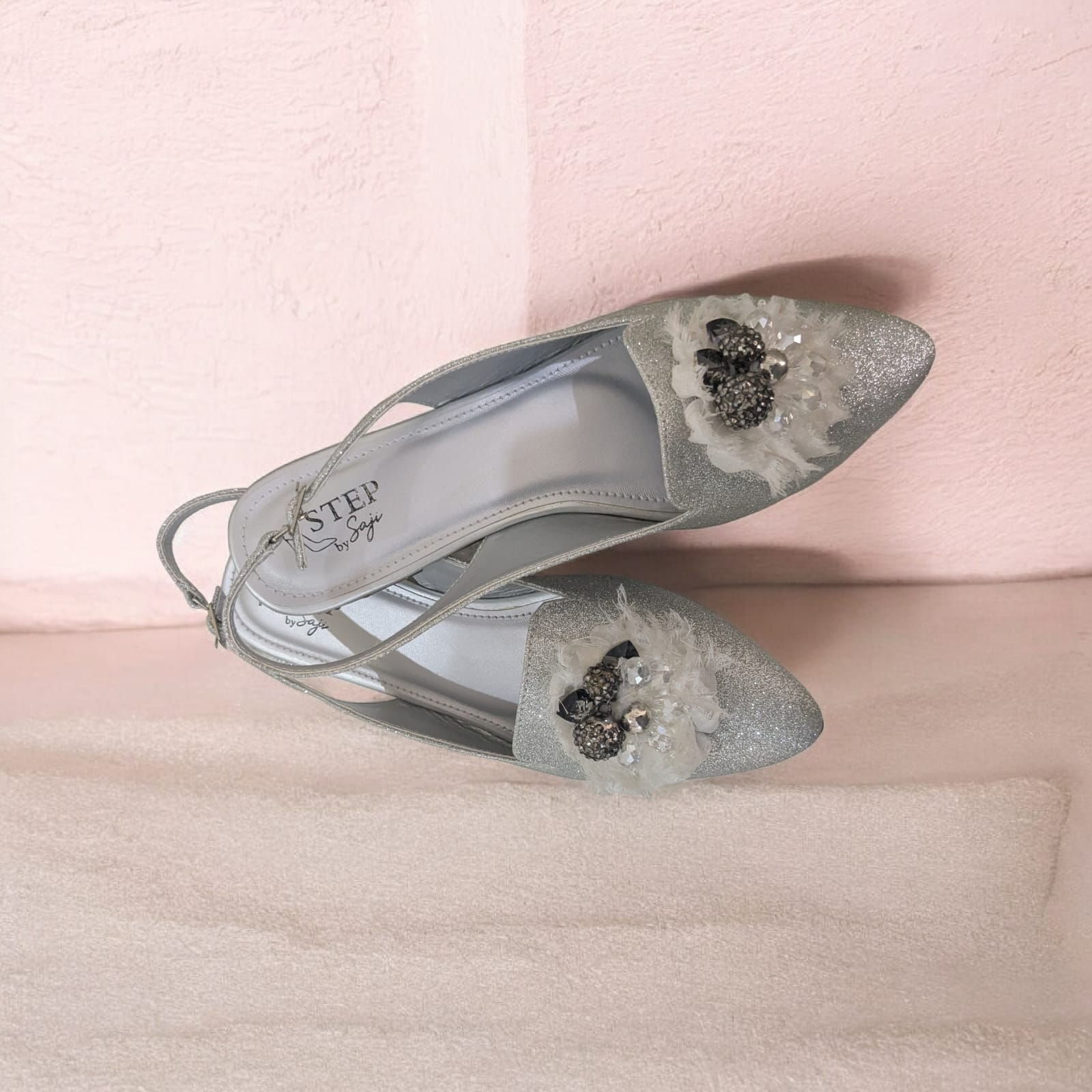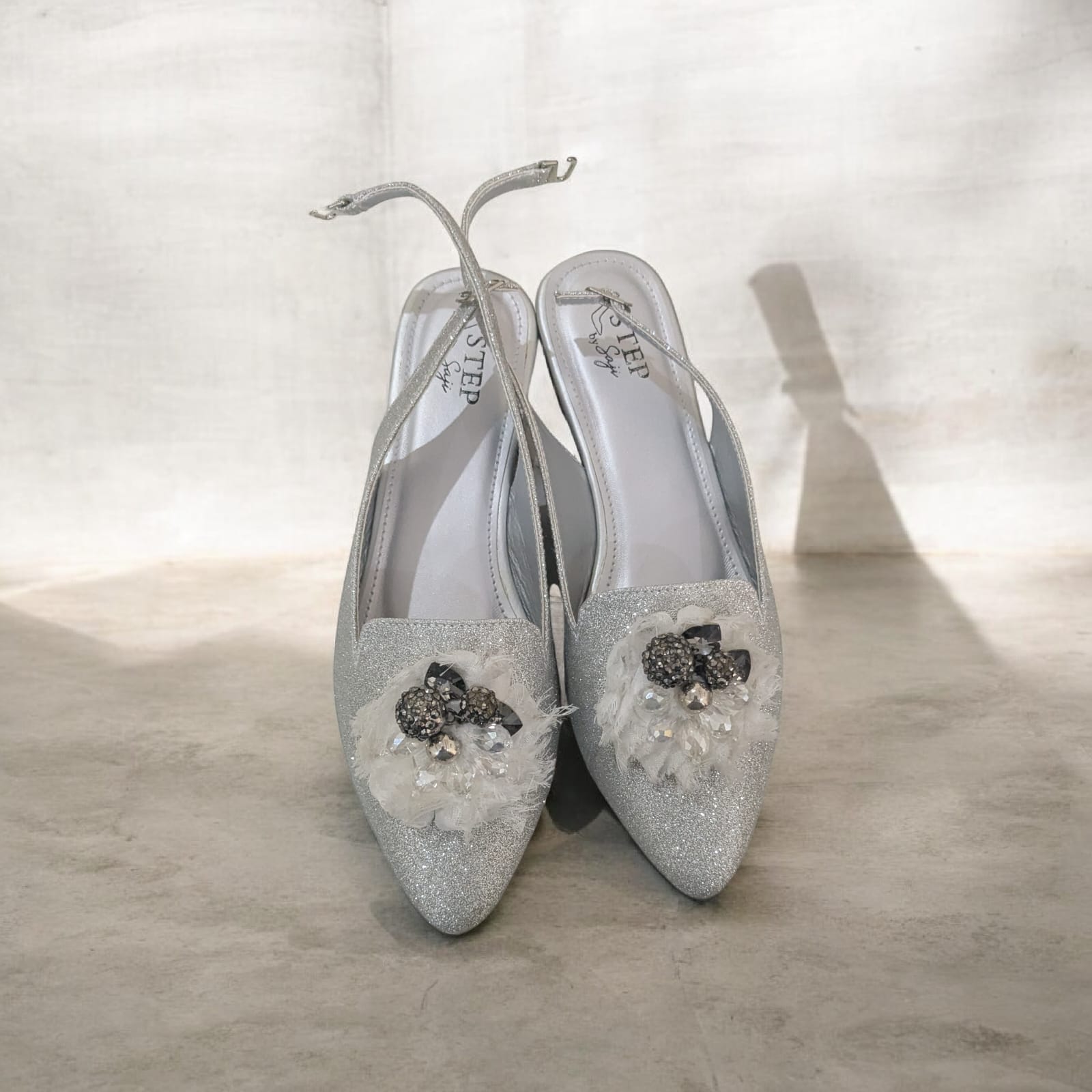 Step into timeless elegance with these silver glitter pointed-toe flats, designed to add a touch of glamour to any special occasion. Crafted with a shimmering metallic finish, these flats feature a delicate floral crystal embellishment on the vamp, combining sparkling rhinestones and soft translucent petals for a luxurious look.